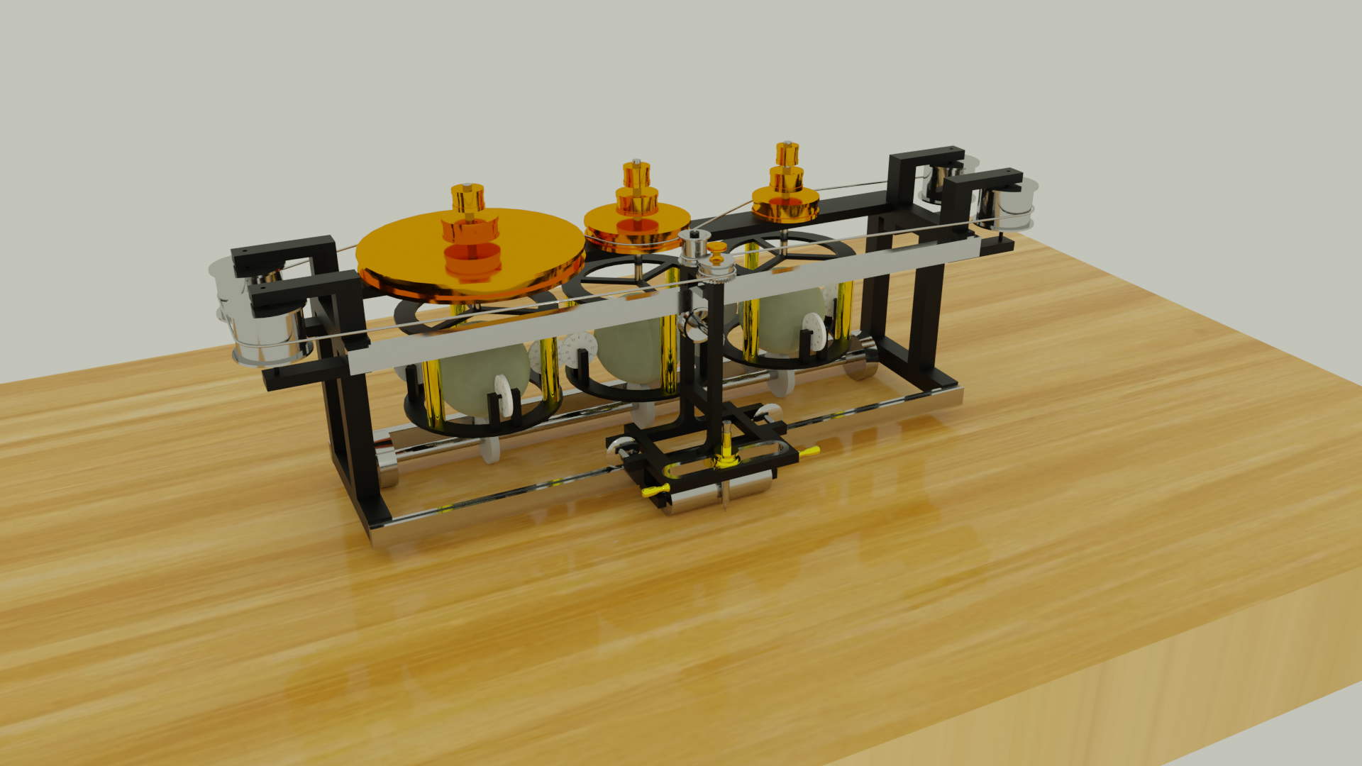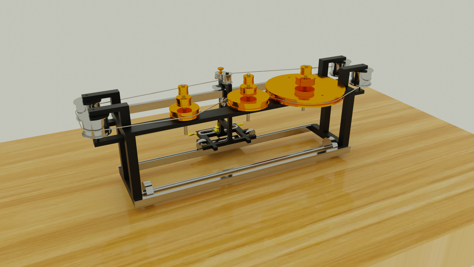 When doing this full slide, the bigger pulley makes one complete rotation, the second bigger makes two etc… More precisely, the n-th pulley have a rotation angle \(\theta_n = x\dfrac{2n\pi}{T}\). For example, for \(n=1\) (the bigger pulley), this angle goes from \(0\) to \(2\pi\) (a full rotation) when \(x=T\).